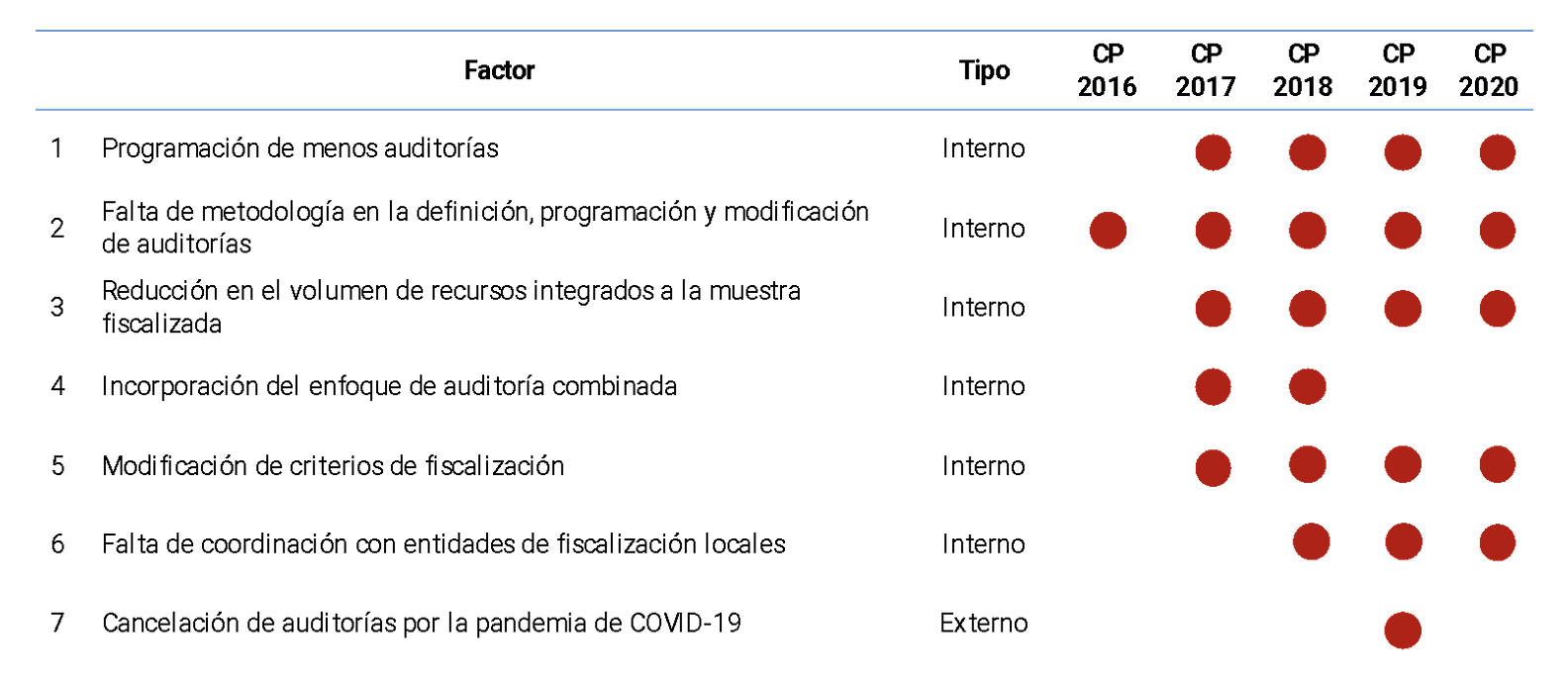 Tabla 1. Factores que inciden en la fiscalización de recursos y determinación de irregularidades, por CP de 2016 a 2020