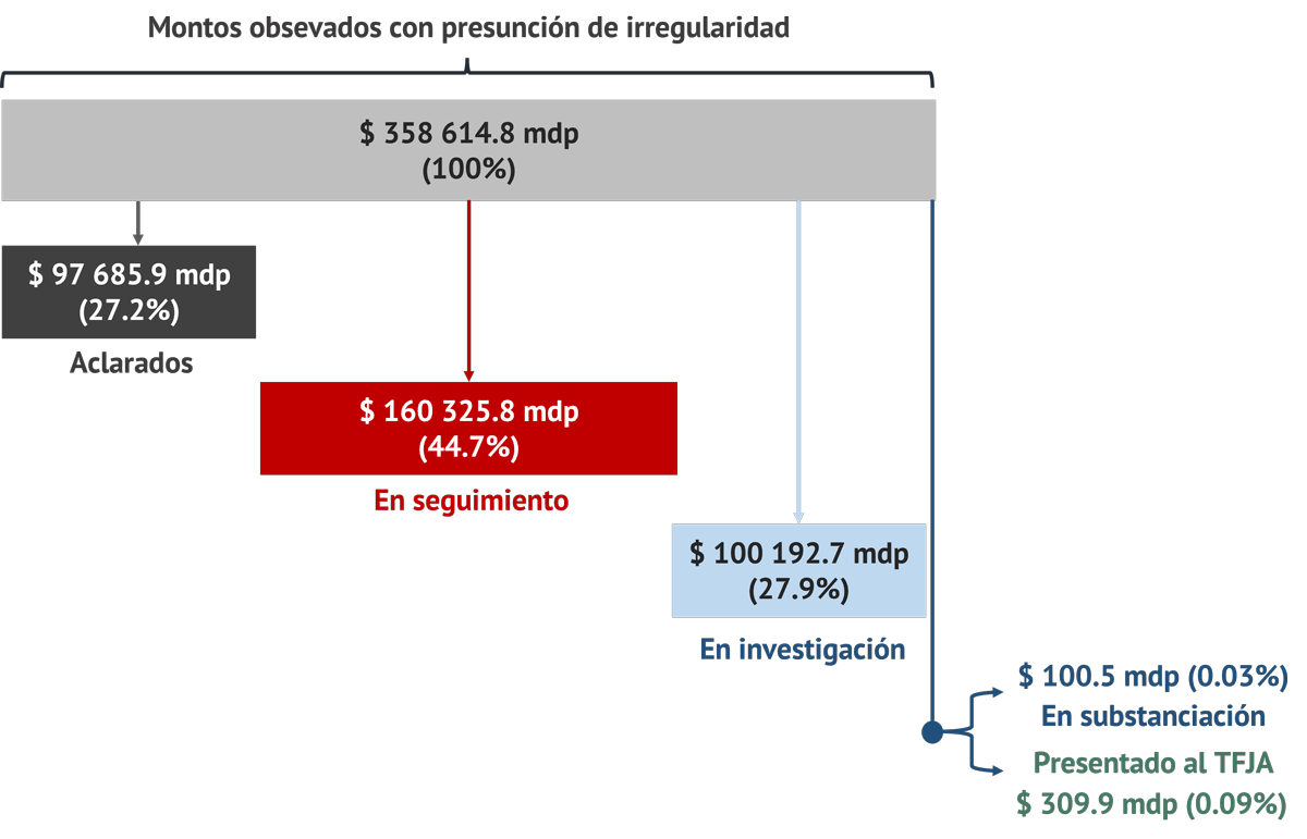 A estos números precarios, se suma que en 27.2 % (97 700 millones de pesos) de los montos observados no se sostuvo la irregularidad, pues en el proceso de seguimiento o investigación fueron solventados, cerrándose el proceso de responsabilidad patrimonial.