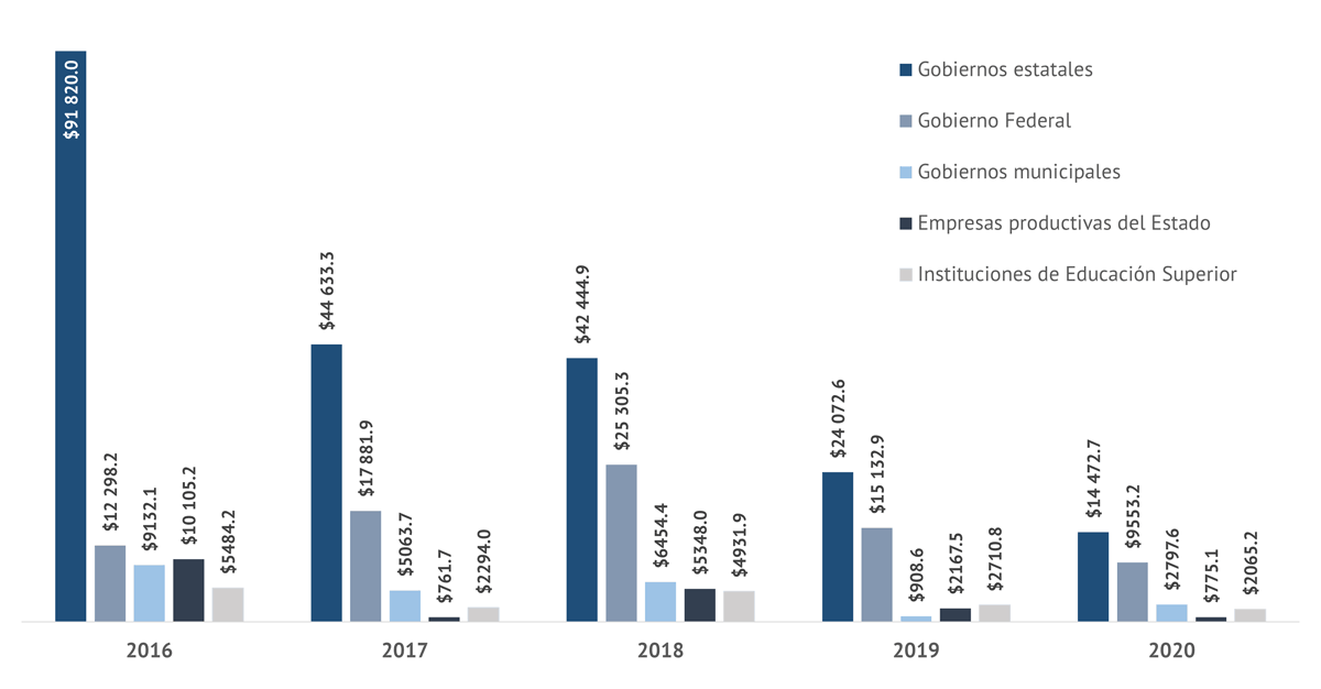 No debe pasarse por alto que dos terceras partes de los recursos ejercidos de manera irregular recaen en los estados y municipios, concentrando estos tres de cada cuatro auditorías. Esta es la razón por la cual las deficiencias en el proceso de fiscalización inciden en mayor grado en la revisión del gasto federalizado (participaciones y aportaciones) que en otros rubros. La tercera parte restante de los montos irregulares se divide entre el gobierno federal (22.4 %), las empresas productivas del Estado (5.3 %) y las instituciones de educación superior (4.9 %).