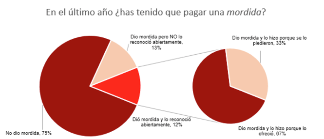 Con base en la encuesta de Reforma y MCCI se sabe que dos de tres ‘mordidas’ fueron solicitadas por funcionarios y sólo una de cada tres fue ofrecida por el ciudadano. Es decir, los resultados obtenidos parecen indicar que el principal problema radica en que los funcionarios son quienes exigen el pago de sobornos. Sin embargo, es posible que los ciudadanos que ofrecieron sobornos tiendan a subdeclarar con mayor frecuencia el pago de mordidas por vergüenza ante el encuestador.