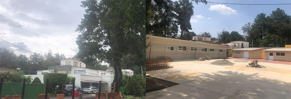 La imagen de la izquierda muestra la vista desde la calle Pérez Valenzuela de las dos casas ubicadas en la calle Retama. Ambos predios se encuentran bajo el registro catastral 052-372. De acuerdo con datos actualizados del INEGI, habría un registro de hasta tres viviendas dentro de los Viveros con un total de 12 habitantes. Estas y otras evidencias, como la remodelación entre 2014 y 2017 del primer domicilio de acuerdo con fotografías de Google Maps, con la cual se le añadió un tercer piso y una terraza, constatan que este espacio es ocupado con un uso de suelo contrario a lo que dispone el artículo 46 fracción Ill de la Ley General del Equilibrio Ecológico y Protección al Ambiente que considera a los parques nacionales como áreas naturales protegidas; además, desde luego, de ser ésta zona federal y jamás haberse cedido legalmente en calidad de propiedad privada. Mientras que la imagen de la derecha muestra el Concejo de la alcaldía Coyoacán, actualmente rehabilitado y apropiado ilegalmente por la alcaldía.